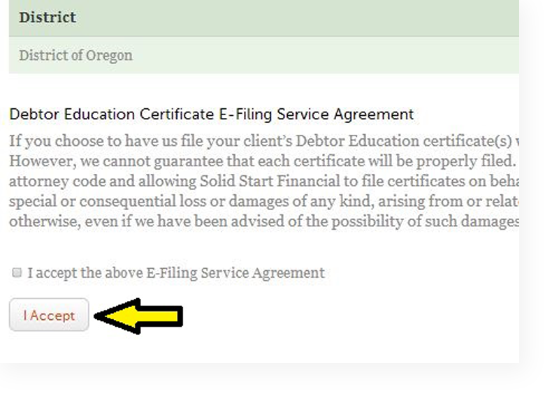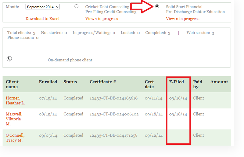 By clicking on the Monthly Activity tab within their attorney account, attorneys can select the Solid Start Financial and see which certificates were eFiled successfully and on what date.
