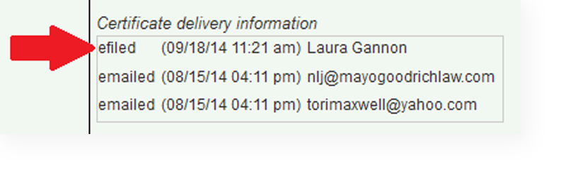 Successful eFiling will show in the certificate delivery information, as below.