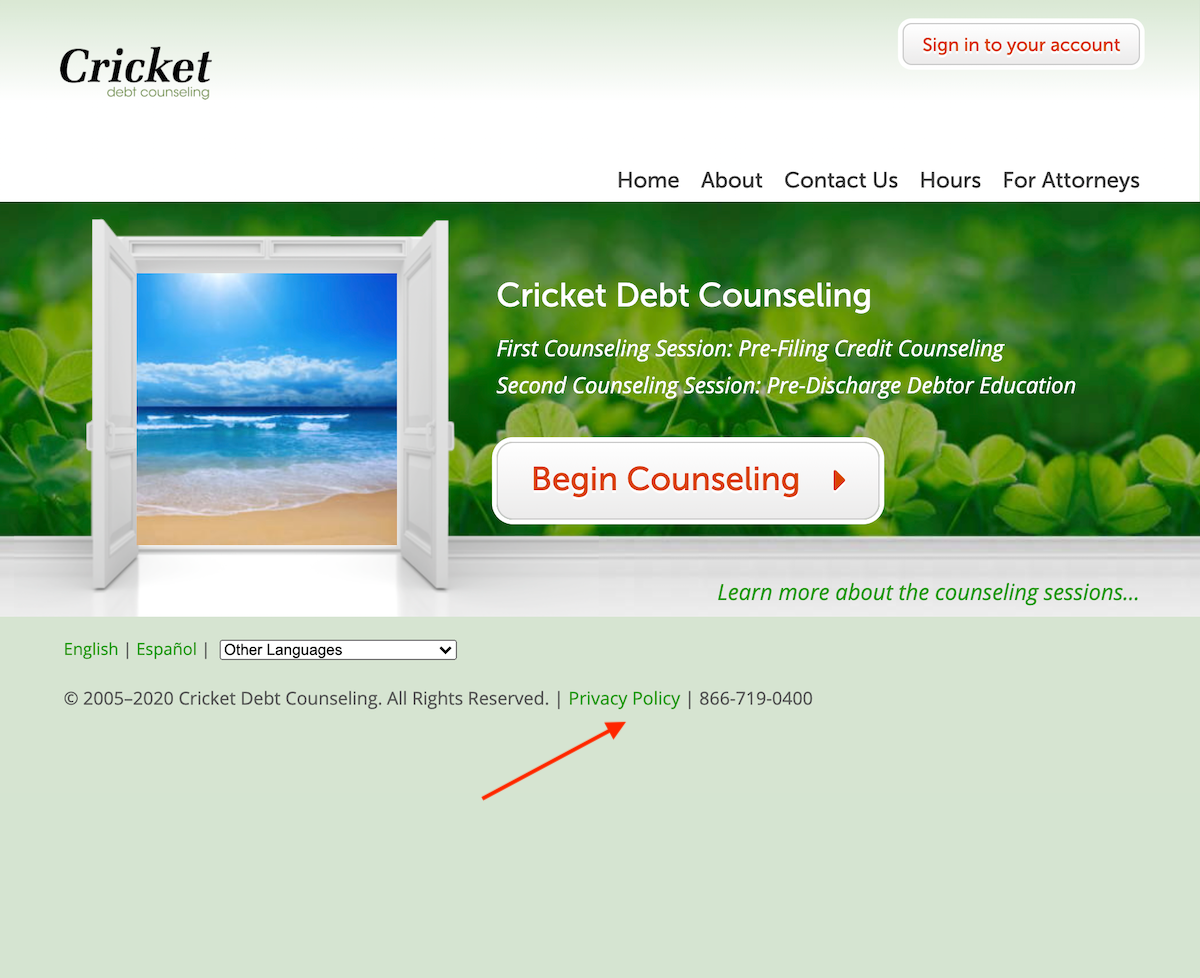 Your privacy is important to us. Cricket Debt Counseling gathers your personal information for the purpose of completing your counseling with us. Your personal information will not be conveyed or disclosed to any third party, except your designated attorney, without your consent, except as may be required by law. Please note that Cricket Debt Counseling may share information about your account upon reasonable request by the United States Trustees Office as it relates to your counseling and/or bankruptcy, and your contact information with affiliates of Cricket Debt Counseling when suitable.